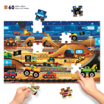 Plongez au cœur de l’action avec ce puzzle de 60 pièces représentant un circuit de Monster Trucks en pleine compétition! Parfait pour les fans de véhicules puissants et impressionnants, ce puzzle captivant met en scène des Monster Trucks en plein saut, franchissant des obstacles, et exécutant des cascades incroyables. Un véritable spectacle qui séduira les petits amateurs de vitesse et de sensations fortes !